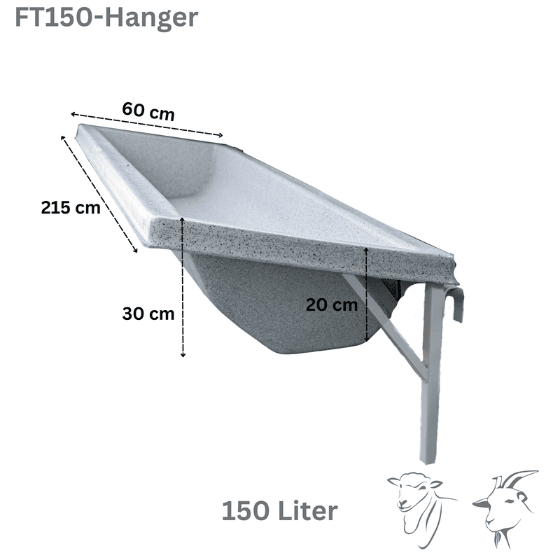 Farmex 150L out hanger feeder trough designed to mount outside the pen, allowing easy feeding from outside without entering the enclosure.